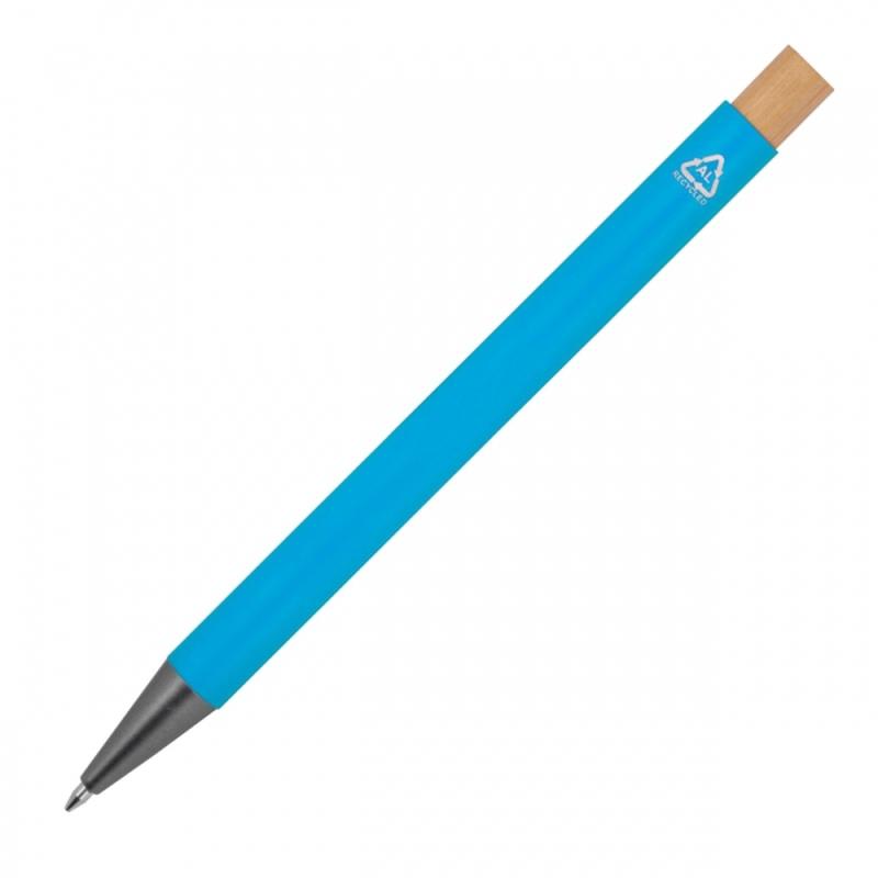 Długopis wykonany z aluminium z recyklingu, bambusowym przyciskiem, metalowym klipsem i wkładem piszącym na niebiesko.