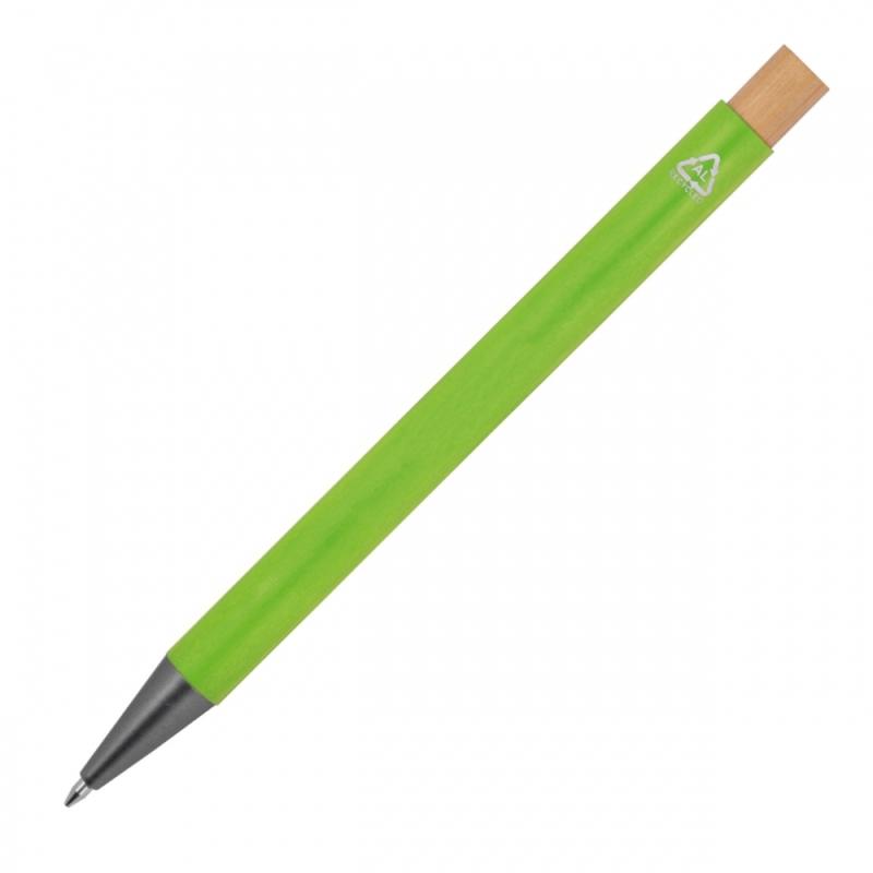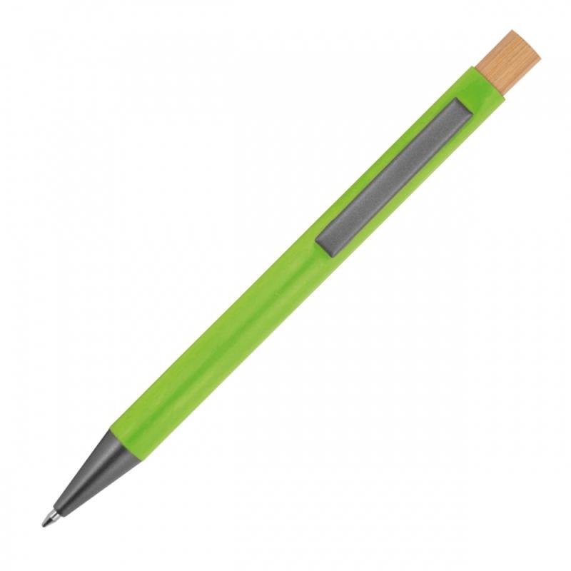Długopis wykonany z aluminium z recyklingu, bambusowym przyciskiem, metalowym klipsem i wkładem piszącym na niebiesko.