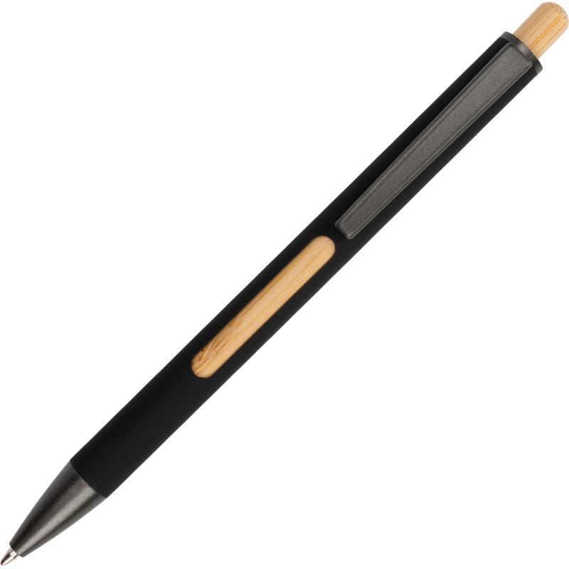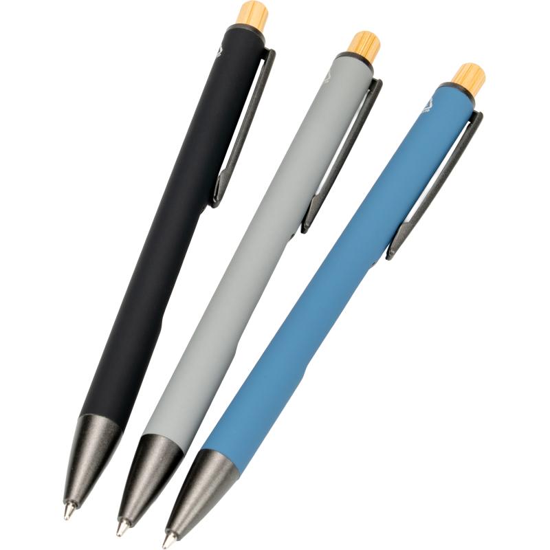 Długopis wykonany z aluminium z recyklingu, metalowym klipsem, bambusowymi akcentami i niebieskim wkładem.