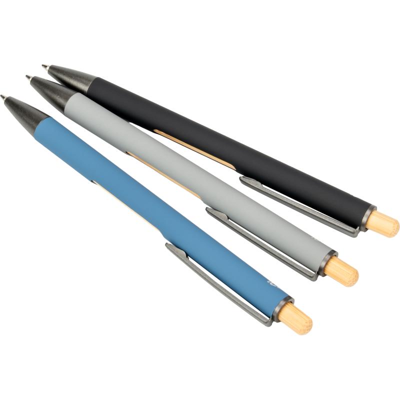 Długopis wykonany z aluminium z recyklingu, metalowym klipsem, bambusowymi akcentami i niebieskim wkładem.