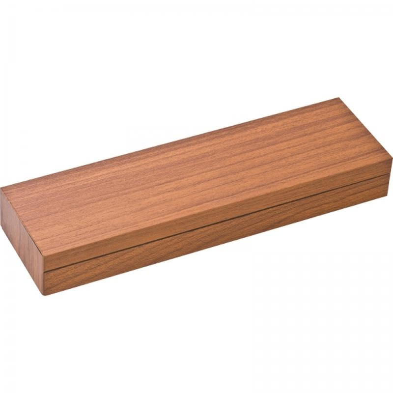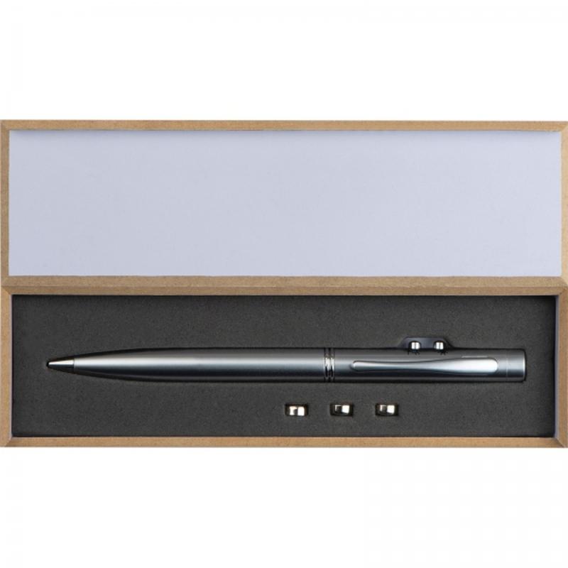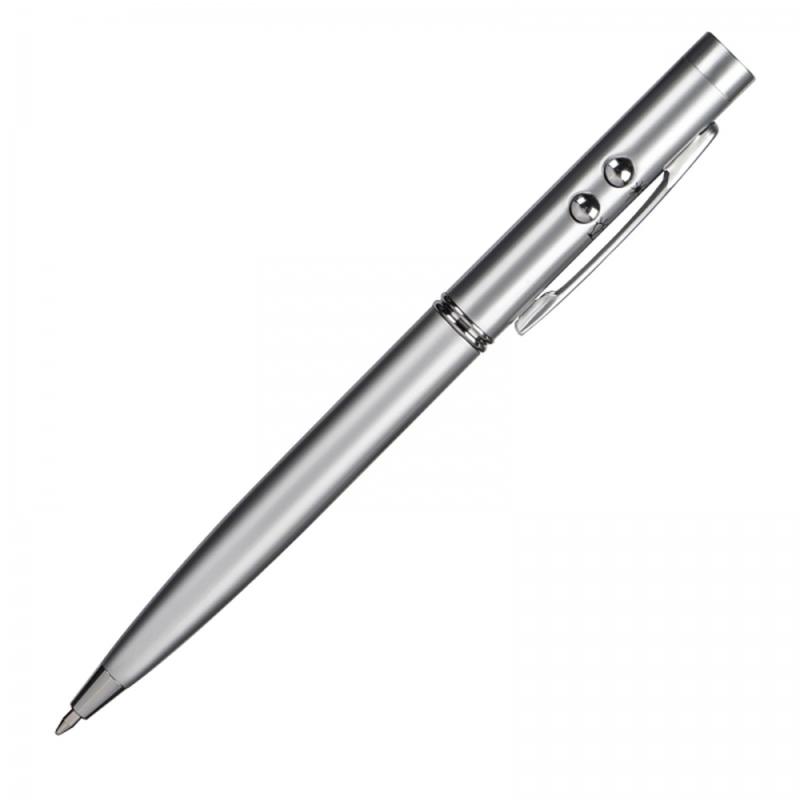 Metalowy wskaźnik laserowy, lampka LED i piszący na niebiesko długopis w jednym. Produkt zapakowany w fornirowane pudełko, zawiera baterie.