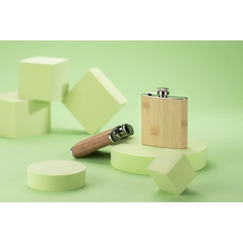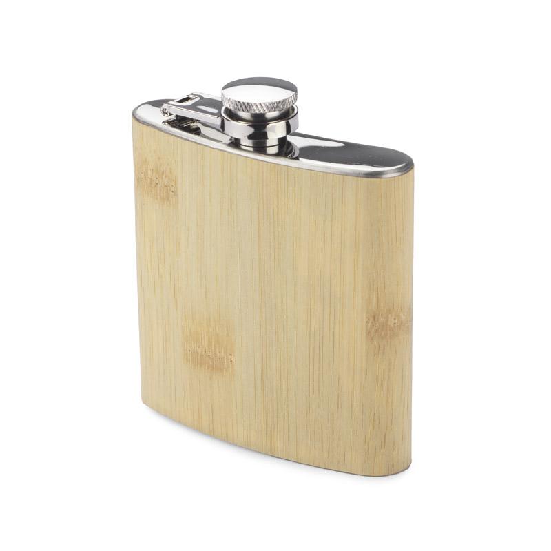 Piersiówka ze stali nierdzewnej o pojemności 200 ml z bezpiecznym zamknięciem. Wykończona jest bardzo cienką warstwą naturalnego bambusa.