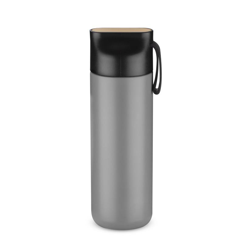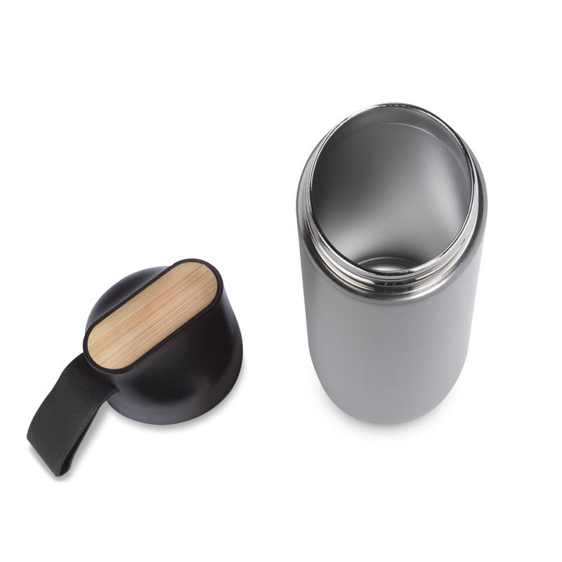 Butelka termiczna ELSA wykonana jest ze stali nierdzewnej o podwyższonym standardzie. Posiada próżnię między ściankami, dzięki czemu utrzymuje temperaturę napoju około 10 godzin. Zakrętka z tworzywa posiada ozdobny element z naturalnego bambusa i silikonowy uchwyt.