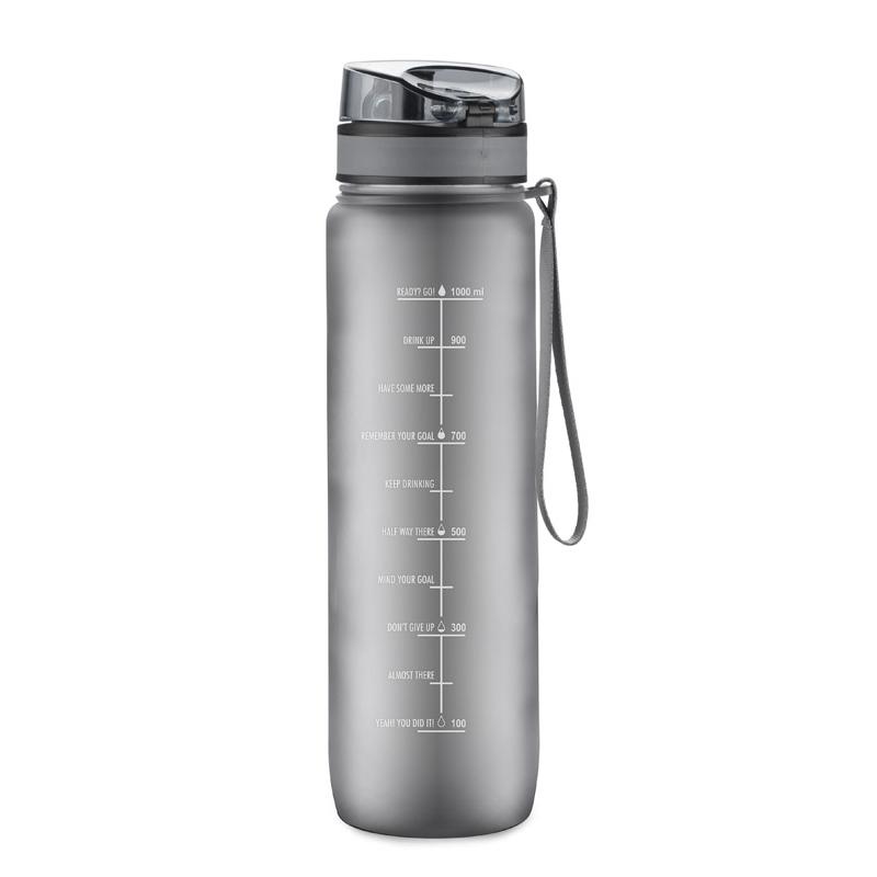 Bidon motywacyjny MOTIVA posiada pojemność aż 1000 ml, dzięki czemu możemy mieć dużą ilość płynu pod ręką. Na ściance butelki nadrukowana jest miarka motywująca w języku angielskim. Korzystając z tej butelki możemy dokładnie monitorować ilość wypitej wody. Sięganie po wodę staje się frajdą.