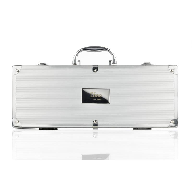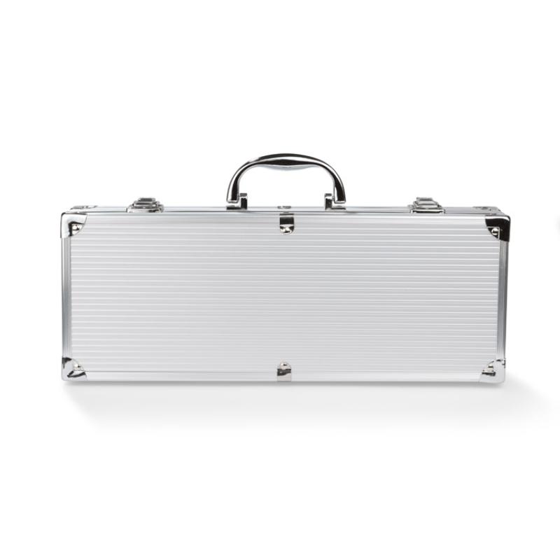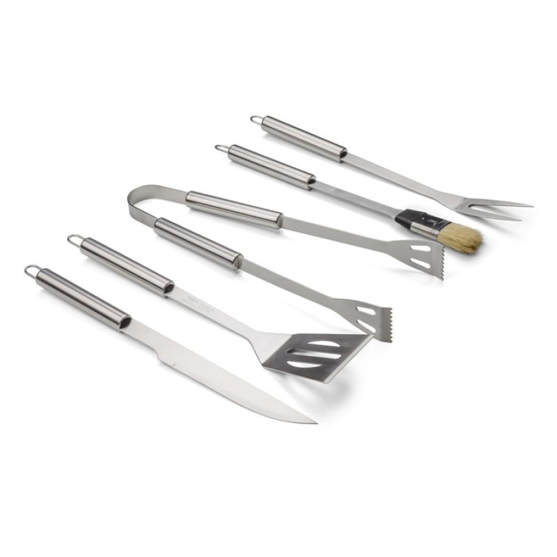 Zestaw do grilla pakowany w walizkę: szczypce, łopatka, nóż, widelec i pędzelek.