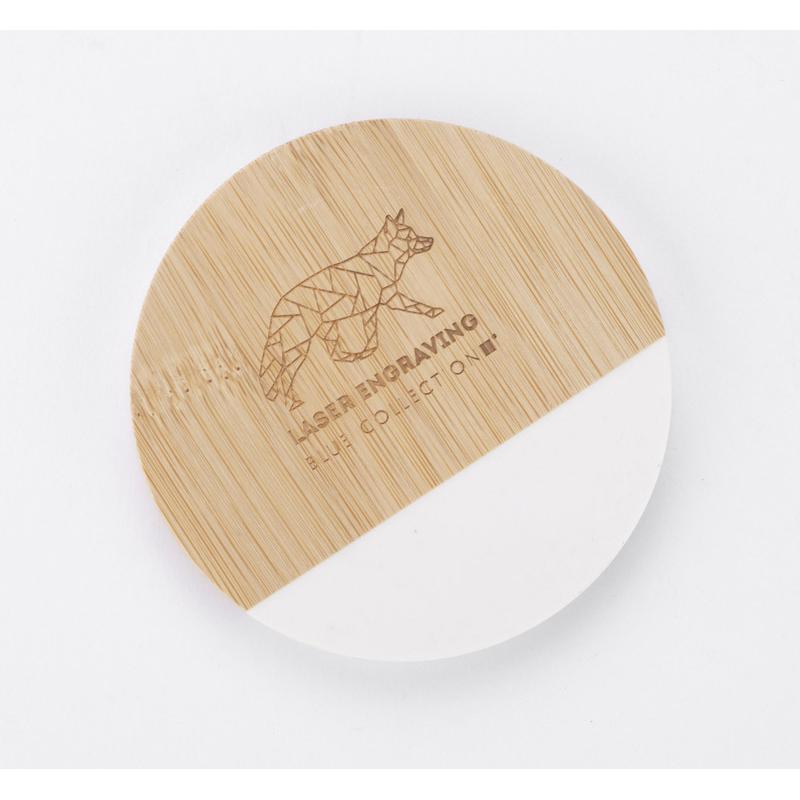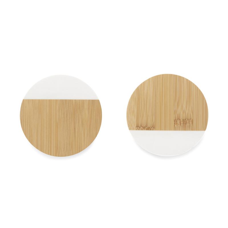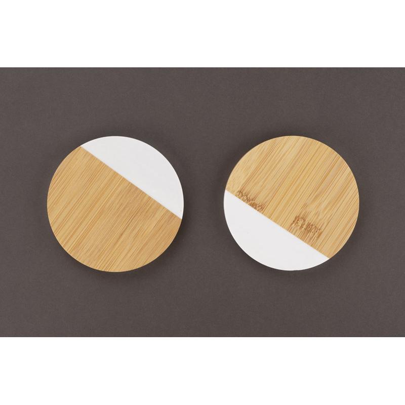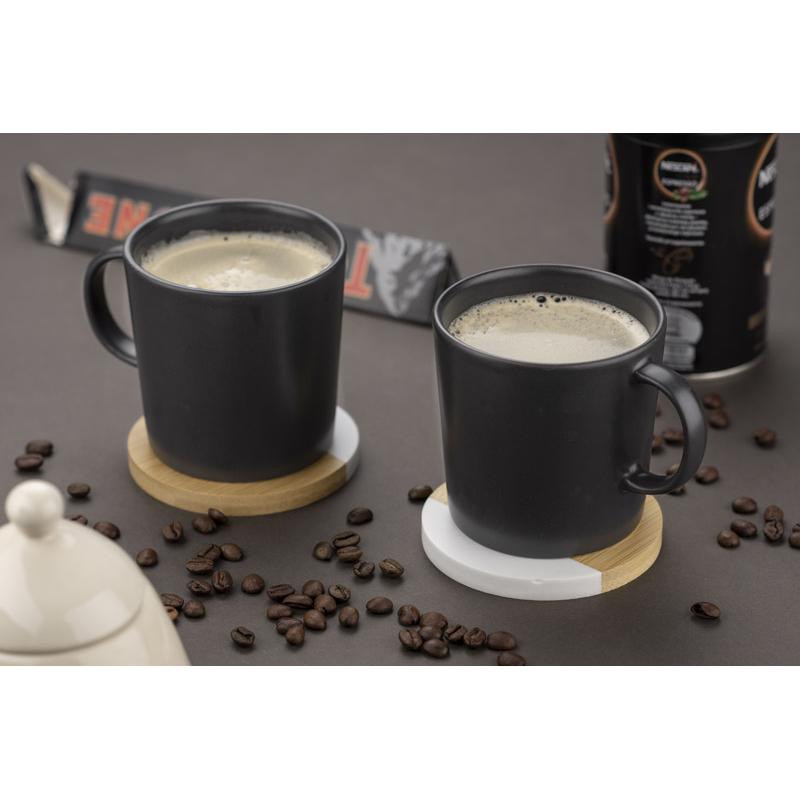 Zestaw dwóch podkładek pod kubek wykonanych z połączenia bambusa i sztucznego marmuru. Materiał jest wytrzymały i odporny na uszkodzenia. Podkładki prezentują się elegancko i z pewnością będą pasowały do niejednego wnętrza. Zapakowane w kraftowe pudełko.