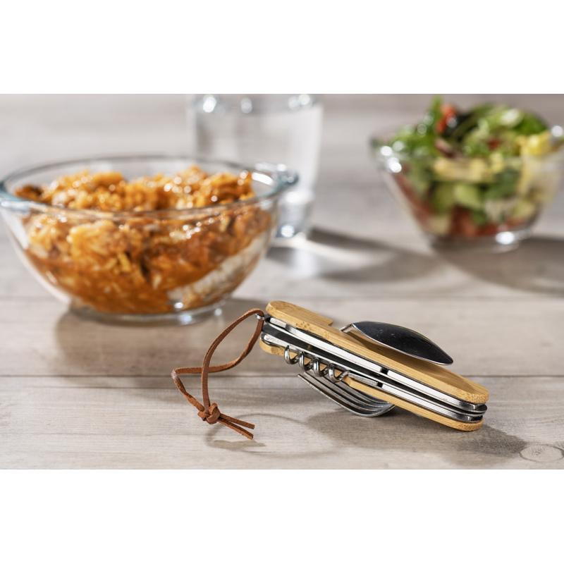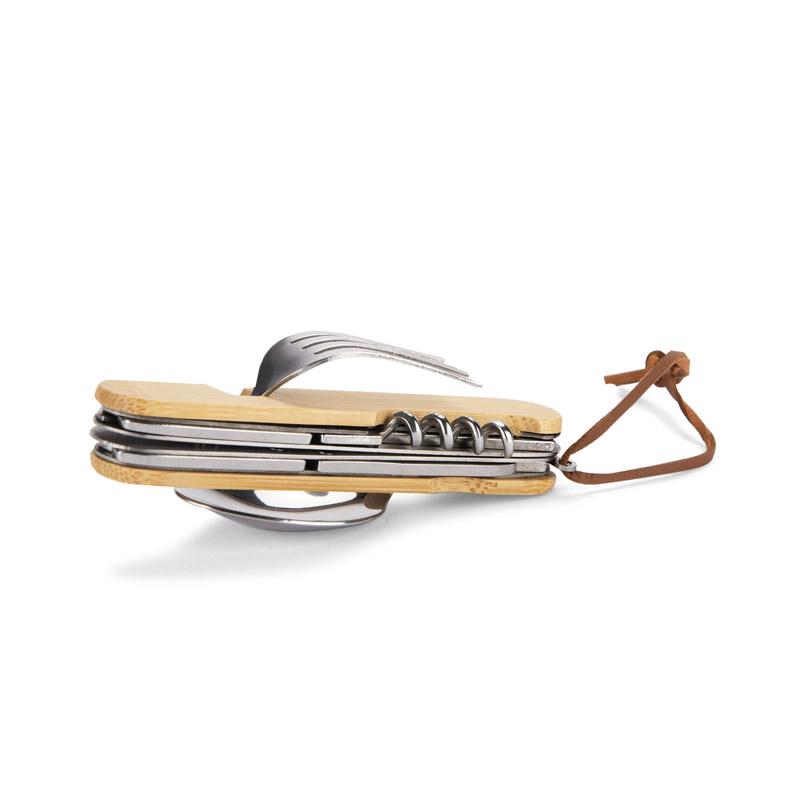 Sztućce turystyczne KENTO to wszechstronny zestaw idealny na wypady outdoorowe, wyposażony w nóż, widelec, łyżkę, korkociąg, otwieracz do butelek oraz śrubokręt. Funkcjonalność 6 w 1 pozwala zaoszczędzić miejsce i sprawdza się w każdej sytuacji w terenie. Oprawa z naturalnego bambusa nadaje zestawowi ekologiczny wygląd i zapewnia lekkość oraz trwałość. Dzięki dołączonemu rzemykowi sztućce można wygodnie przypiąć do plecaka lub paska. KENTO to doskonały wybór dla miłośników przygód i praktycznych rozwiązań.