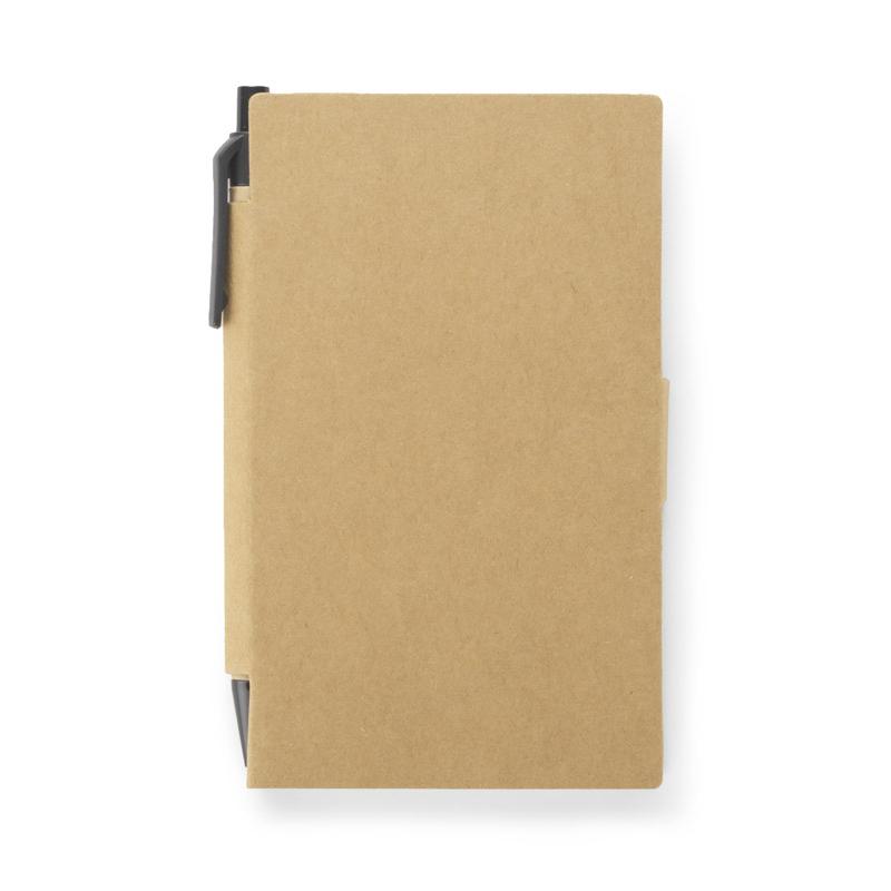 Notes z karteczkami memo oraz długopisem. Notes w oprawie tekturowej. Długopis ekologiczny wykonany z tektury i tworzywa z recyklingu. Na notesie logo nadrukujemy techniką tampodruku. Długopis z czarnym wkładem.