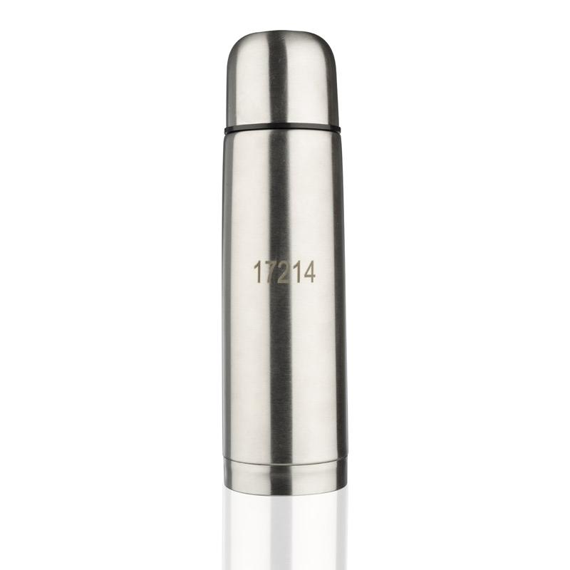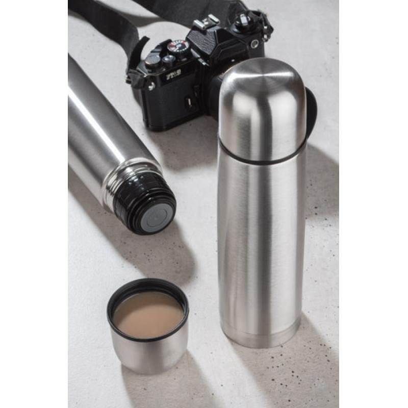 Termos o podwójnych ściankach, wykonany ze szlachetnej stali, został wyposażony w praktyczne zamknięcie oraz metalowy kubek. Pojemność termosu 500 ml, nakrętki-kubeczka 90 ml. Logo grawerujemy na powierzchni termosu.