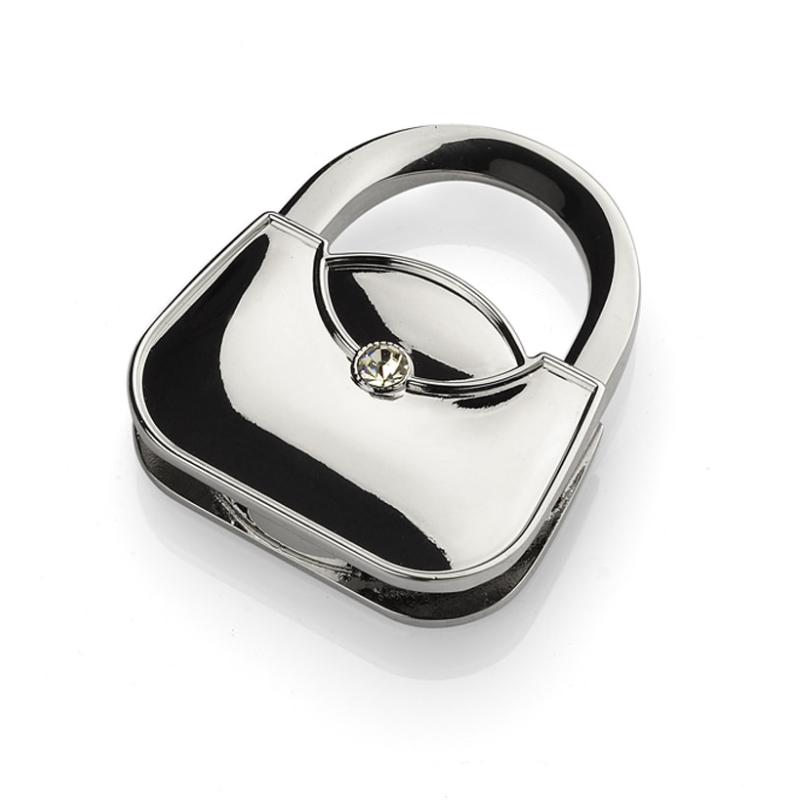Składany wieszak na torebkę w kształcie damskiej torebki wykonany z metalu. Wieszak ozdobiony szkiełkiem zapewniającym mu elegancki wygląd. Pakowany w czarne pudełeczko. Na powierzchni wieszaka wykonujemy znakowanie grawerem.