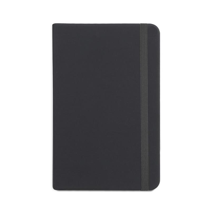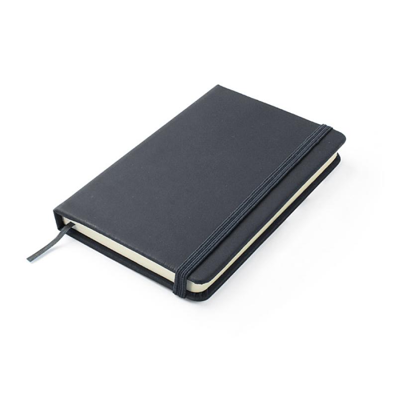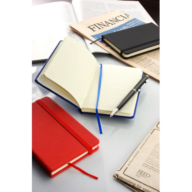 Gustowny notes A6 z kolorową gumką wykonany z materiału skóropodobnego (PU). Notes zawiera 80 kartek ecru w linie koloru pomarańczowego. Logo nadrukujemy na okładce.