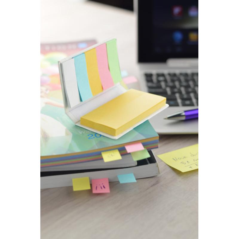 LECTURE to mały, podręczny notesik z kompletem karteczek samoprzylepnych. Zawiera 5 kolorów małych karteczek po 25 szt./kolor oraz 70 szt. dużych karteczek. Nadruk logo wykonamy na notesiku. Układ poszczególnych kolorów karteczek samoprzylepnych w ramach jednej partii może się różnić.