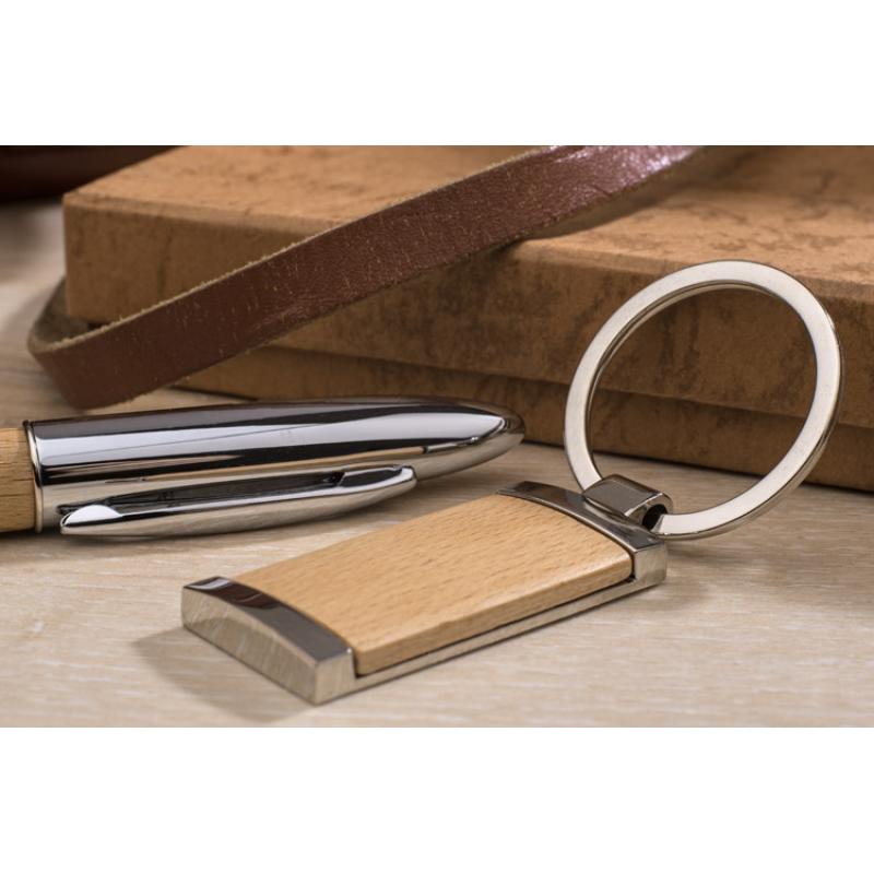 Ekologiczny zestaw upominkowy składający się z długopisu oraz breloka wykonanych z metalu i drewna. Długopis z czarnym wkładem. Grawer zrobimy na długopisie lub też nadrukujemy logo na pudełku.
