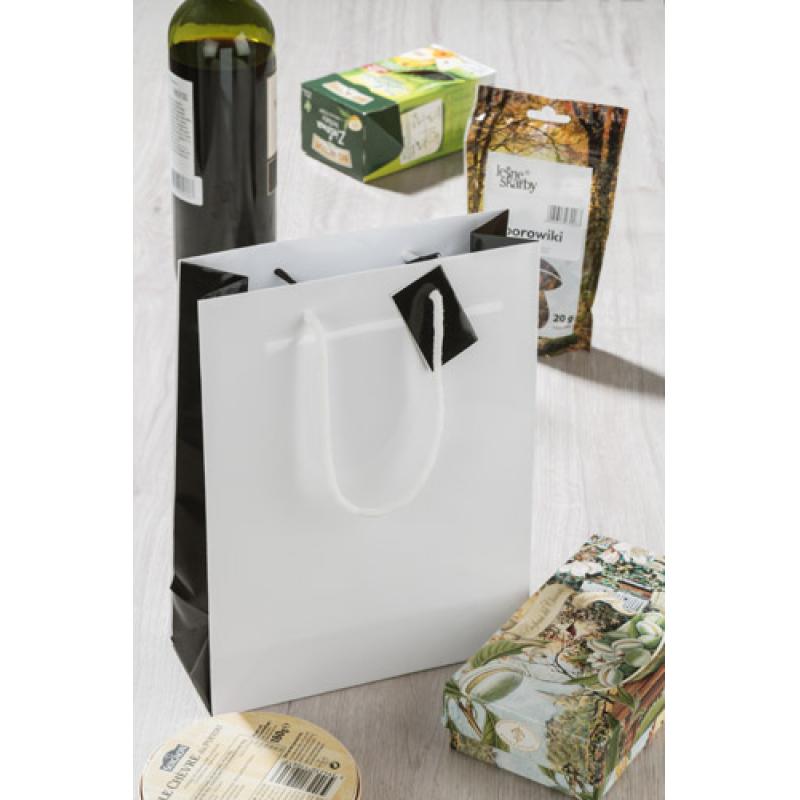 Uniwersalna torba papierowa do pakowania prezentów będzie pięknym opakowaniem nie tylko świątecznych upominków. Posiada eleganckie czarne boki, które są jej dodatkową ozdobą. Torba z rączkami ze sznurka, do rączek dołączony bilecik, na którym można wydrukować logo lub wpisać własny tekst życzeń. Gramatura papieru 157 gsm.