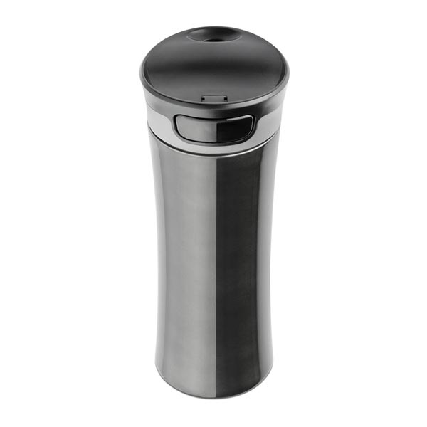 Niesamowity gadżet łączący w sobie poręczność kubka termicznego z właściwościami termosu. Pojemność 400 ml. Wykonany z metalu i tworzywa, wnętrze ze stali nierdzewnej. Utrzymuje temperaturę aż do 10 h. Wieczko otwiera się za pomocą specjalnego przycisku. Kubek niekapek, zapewniający bardzo wysoki poziom szczelności. Znakowanie możliwe na korpusie.