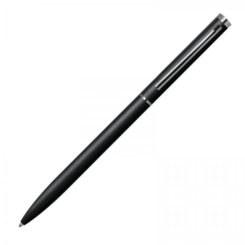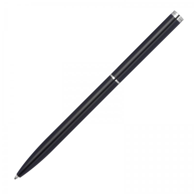 Metalowy długopis z chromowanym klipsem i wkładem piszącym na niebiesko.