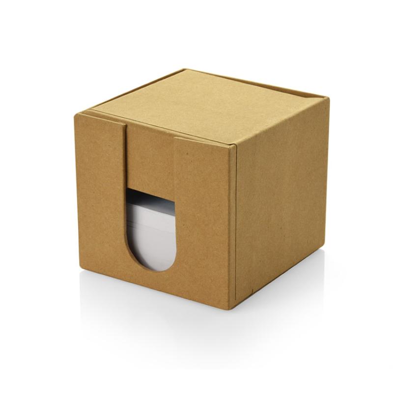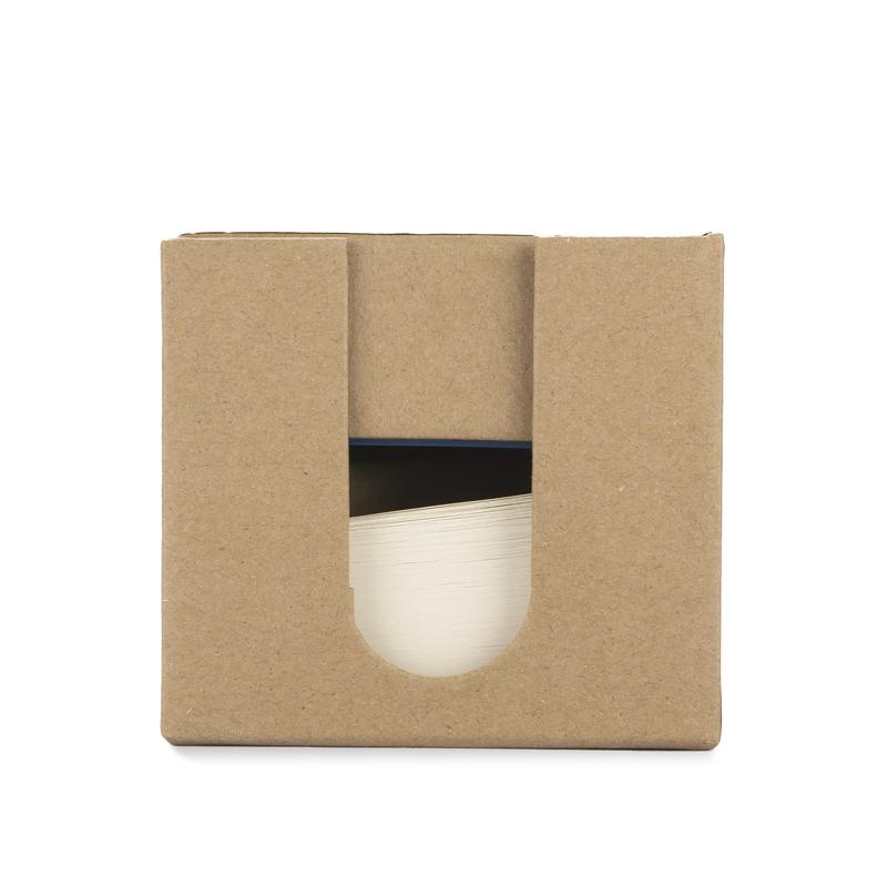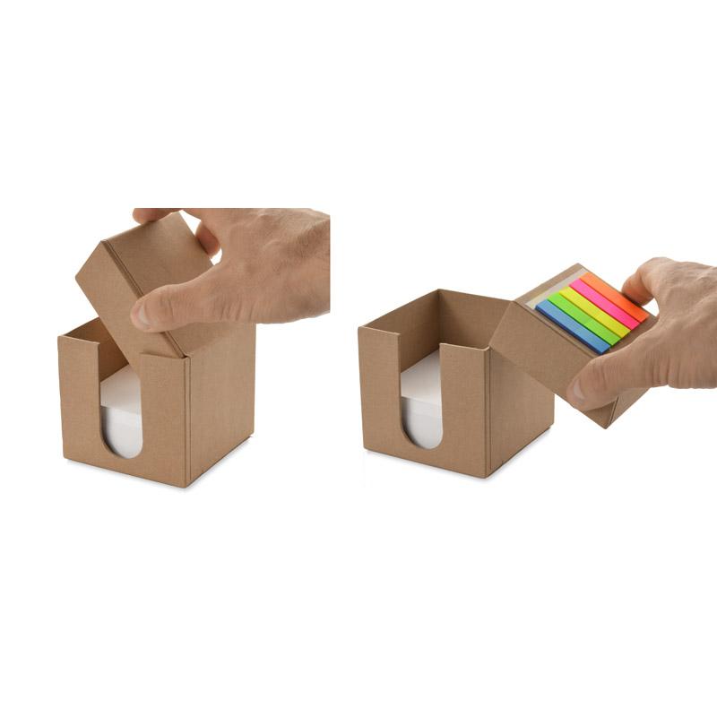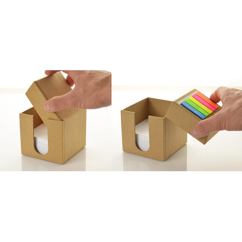 Oryginalny zestaw karteczek w tekturowej kostce - zestaw ten można rozłożyć do formy wygodnego stojaka na biurko. W środku znajduje się zestaw białych karteczek biurowych, pojemnik na artykuły piśmiennicze oraz kolorowe zakładki samoprzylepne z tworzywa PET. Tworzywo PET użyte do produkcji zakładek sprawia, że znacznie lepiej kleją się do kartek i są trwalsze w porównaniu do zakładek papierowych. Jeżeli szukasz funkcjonalnego produktu, który jednocześnie jest ekologiczny to jest to idealny wybór. W zestawie długopis. Znakowanie jest możliwe na opakowaniu.