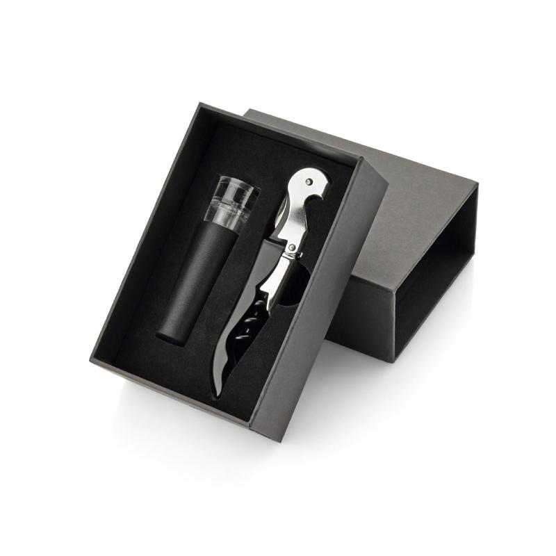 Dwuelementowy, elegancki zestaw do wina zawiera próżniowy korek oraz korkociąg. Próżniowy korek z pompką zasysającą powietrze z butelki pozwala na dłuższe przechowywanie otwartego wina bez utraty cennych aromatów. Zestaw jest zapakowany w eleganckie czarne pudełko.