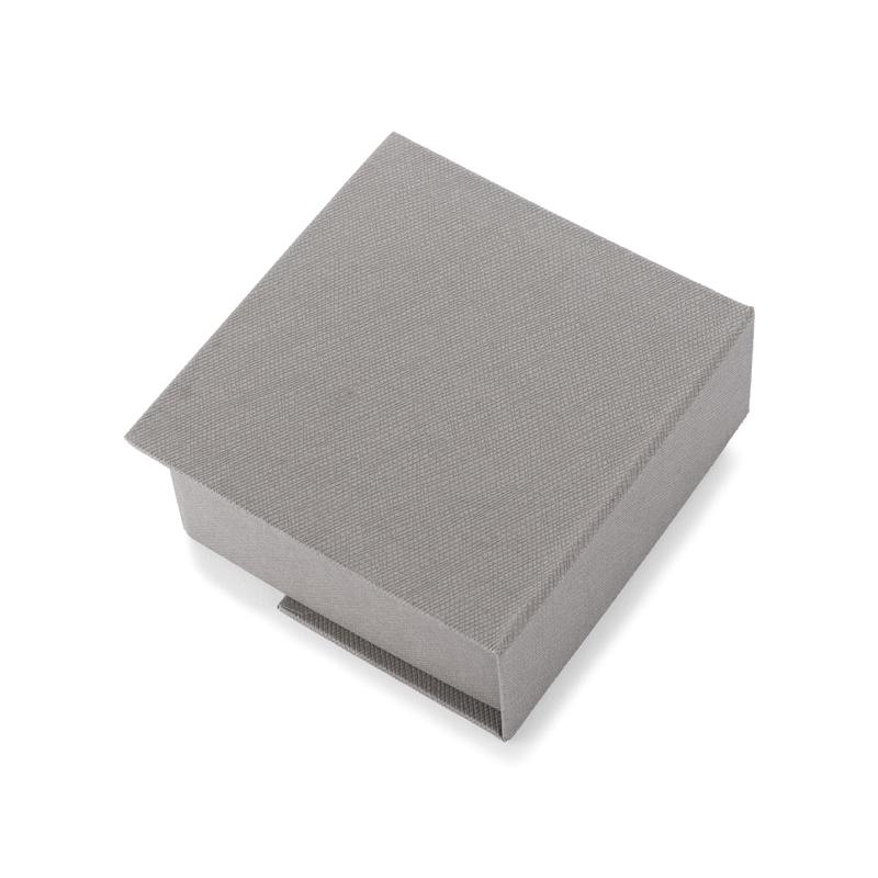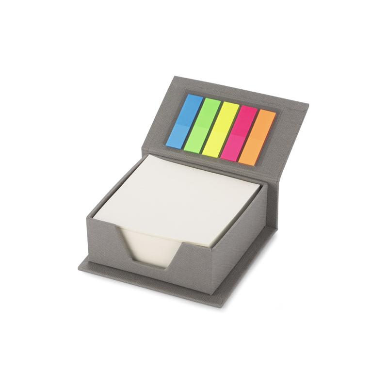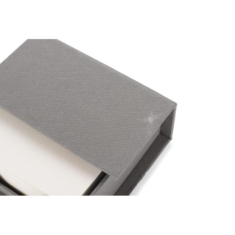 Praktyczna kostka z zestawem karteczek na biurko wykonana z szarego papieru o teksturze drobnej kratki. Kostka zawiera 300 luźnych kartek na notatki. Na wewnętrznej stronie wieczka przyklejone karteczki memo w pięciu kolorach.