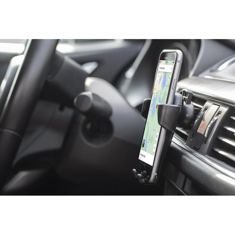 CUERO to bardzo wygodny uchwyt grawitacyjny na telefon do montażu w kratce wentylacyjnej samochodu. Kiedy telefon znajdzie się w uchwycie, siła nacisku powoduje, że ramiona uchwytu zaciskają się, a urządzenie jest skutecznie zabezpieczone przed upadkiem. Uchwyty od wewnątrz pokryte są gumą, co poprawia stabilność chwytu. Uchwyt pasuje do telefonów o szerokości w przedziale 65-88 mm, telefon nie powinien znajdować się w etui. Dzięki imitacji powierzchni skórzanej świetnie zaprezentuje się w Twoim samochodzie.