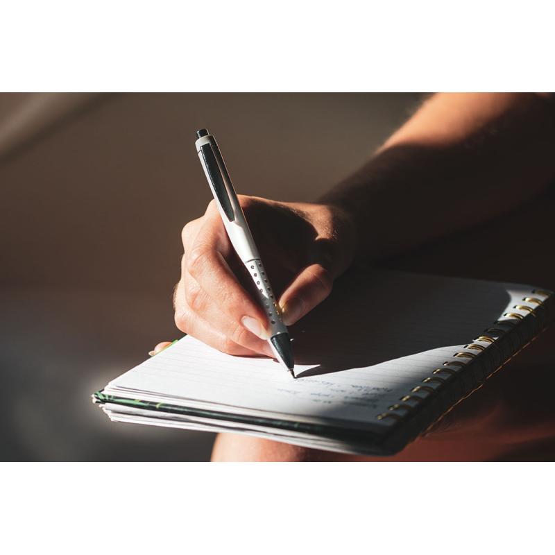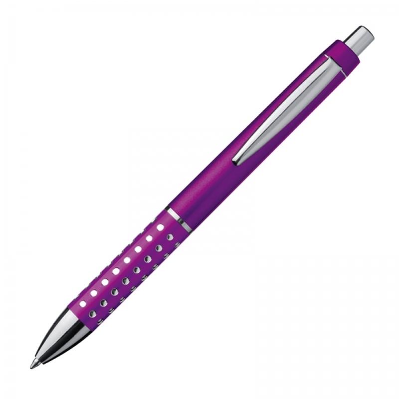 Plastikowy długopis o ozdobnym korpusie, z wkładem piszącym na niebiesko.