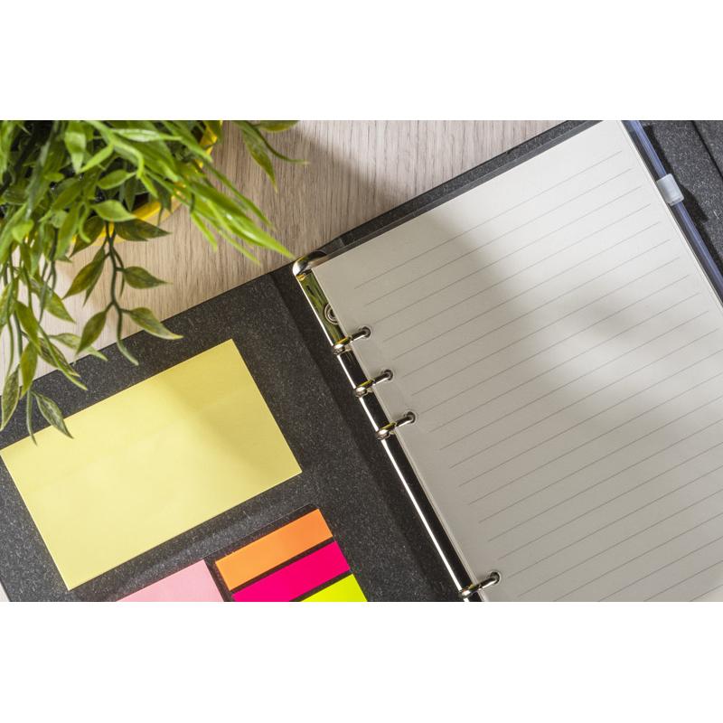 Organizer NOTI zawiera 60 kartek w linie z możliwością ich wymiany. Dzięki temu produkt posłuży na długi czas. Wewnątrz znajdują się kolorowe karteczki samoprzylepne, a także transparentna kieszonka zamykana na suwak do przechowywania artykułów biurowych, wizytówek czy na przykład maseczki ochronnej. Okładka zamykana na magnes, wykonana z papieru.
