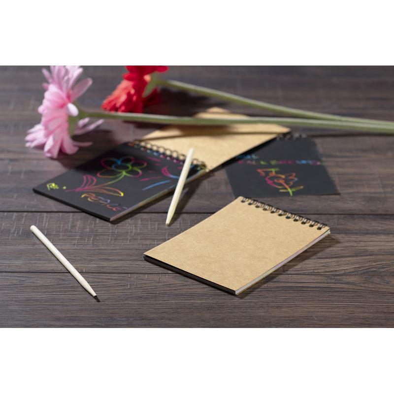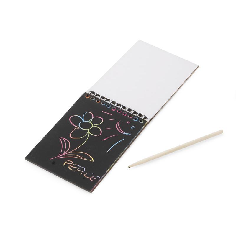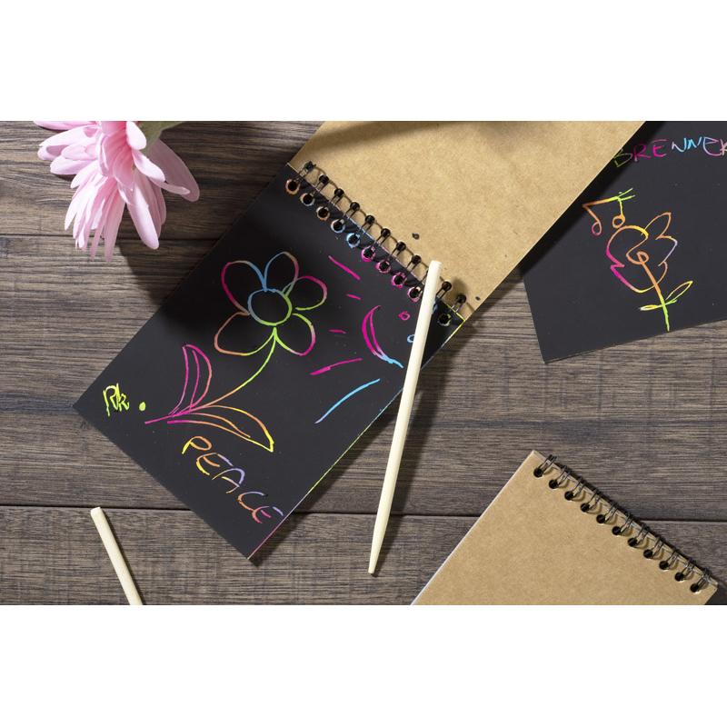Nietypowy notesik z czarnymi kartkami do zdrapywania. Za pomocą bambusowego patyczka można wykonać kolorowy, tęczowy obrazek. Pozwala to na rozwijanie wyobraźni poprzez możliwość tworzenia własnych kompozycji zdrapywanek.