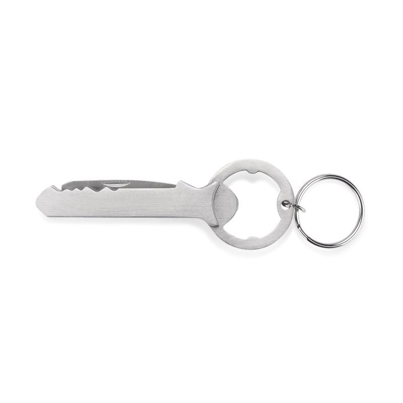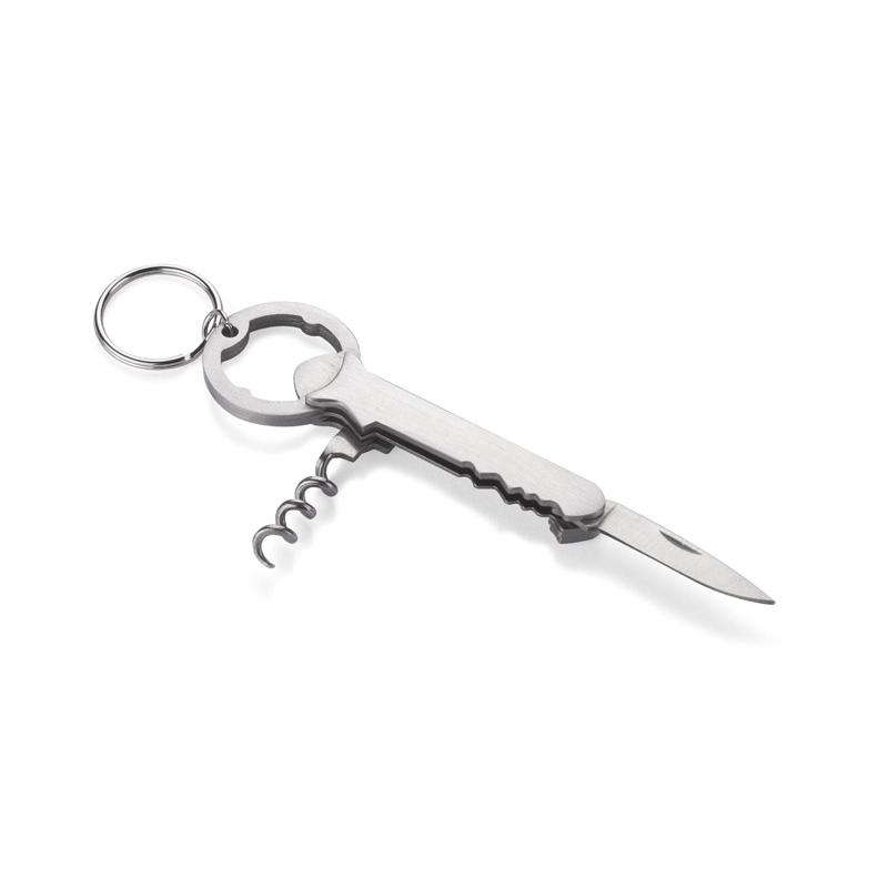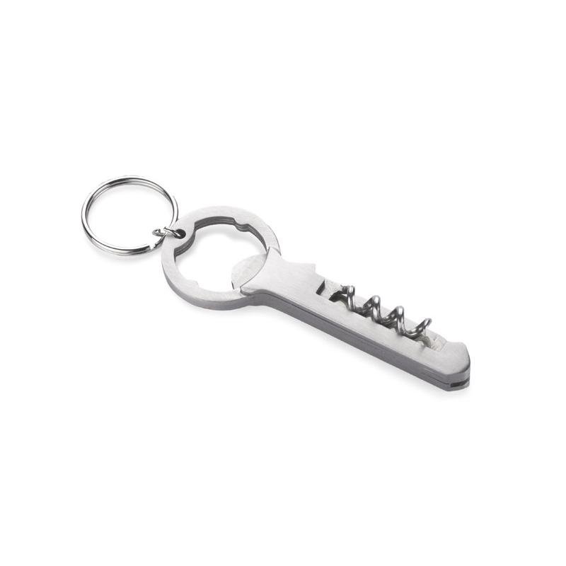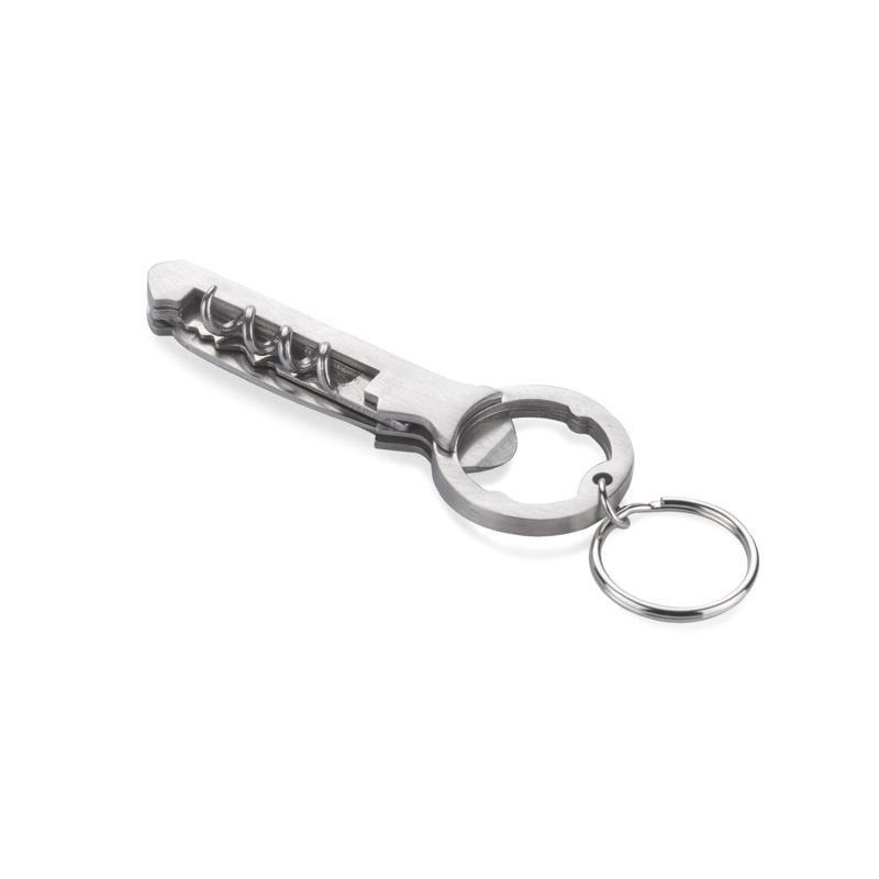 Alco posiada 3 funkcje: brelok, otwieracz do kapsli oraz korkociąg do wina. Wykonany ze stali nierdzewnej. Zapakowany w brązowy kartonik.
