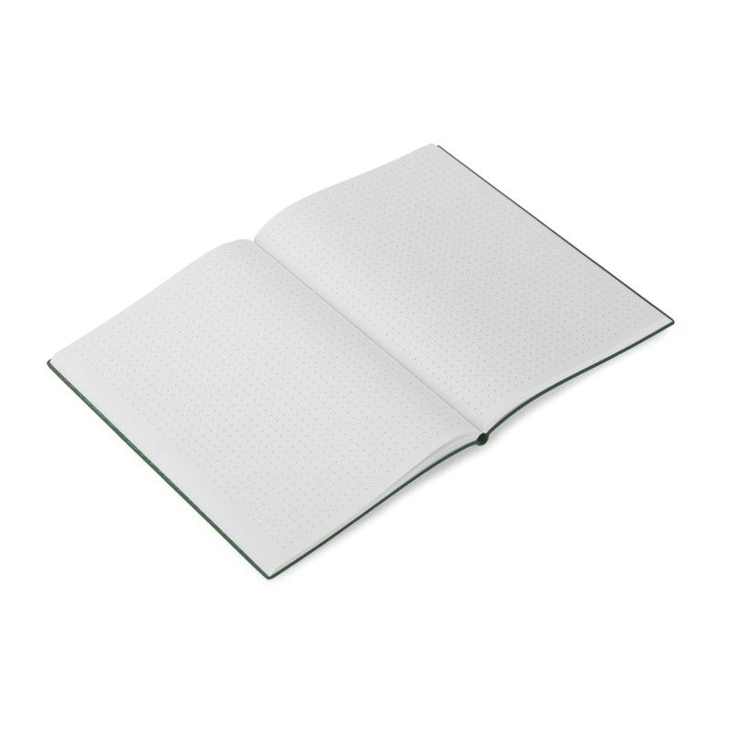 Kartki w notesie wyprodukowane zostały z papieru kamiennego. Taki papier jest wyjątkowo odporny na rozdarcia oraz na wilgoć. Posiada 80 kartek w kropki. Format A5.