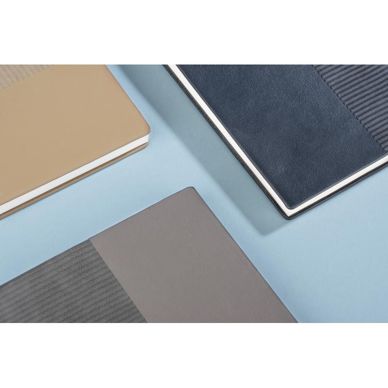 Notes FLAF w formacie A5 występuje w 3 stonowanych i eleganckich kolorach. Notes w miękkiej, okładce z łączonych materiałów: skóropodobnego (PU) i imitacji sztruksu, który jest niezwykle przyjemny w dotyku. Zawiera 80 kartek w kropki. W środku dodatkowo praktyczna wstążeczka - zakładka.