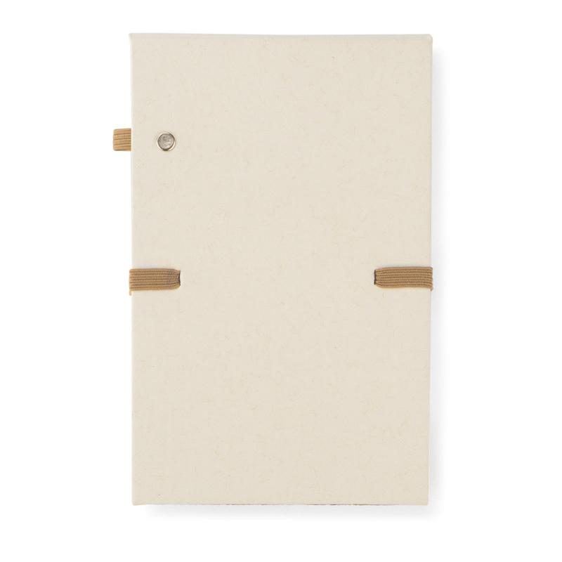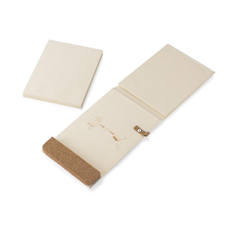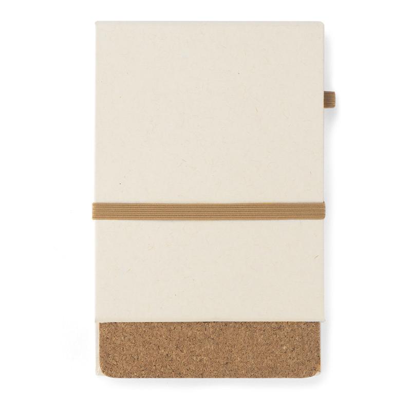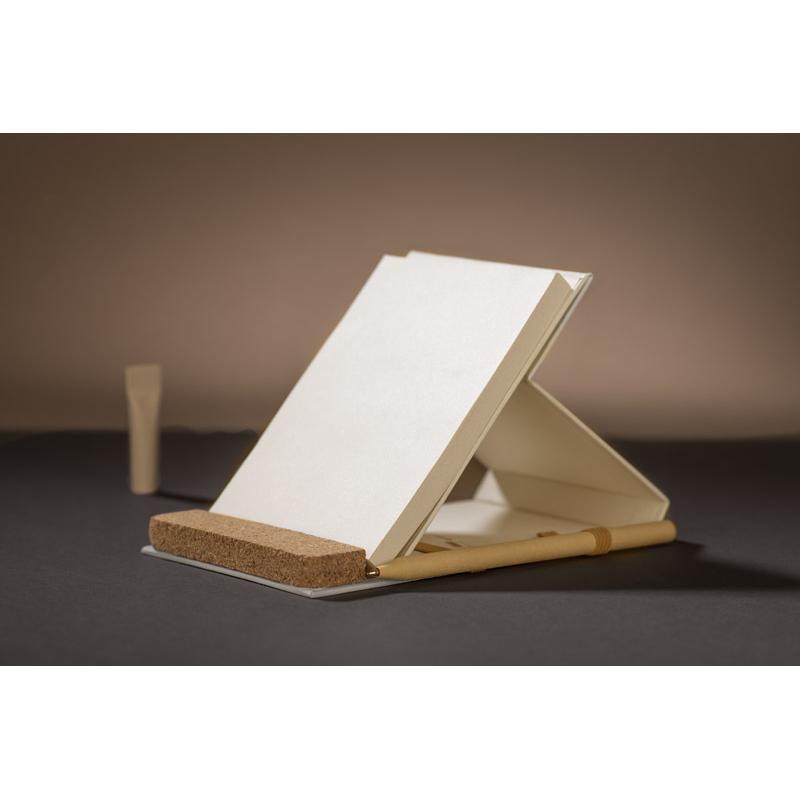 Okładka i kartki w notesie zostały wyprodukowane z kartonów po mleku. Okładka zamykana za pomocą elastycznej gumki. Korkowy element dopełnia ten produkt wizualnie, a także umożliwia stworzenie z notesu stojaka na telefon. Notes posiada 80 gładkich kartek.