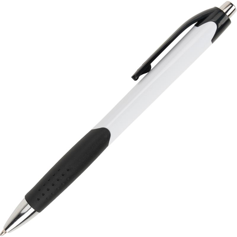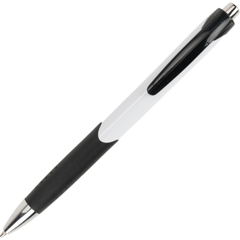 Długopis plastikowy, wyposażony w klips i gumową strefę chwytu oraz niebieski wkład.