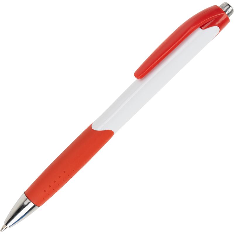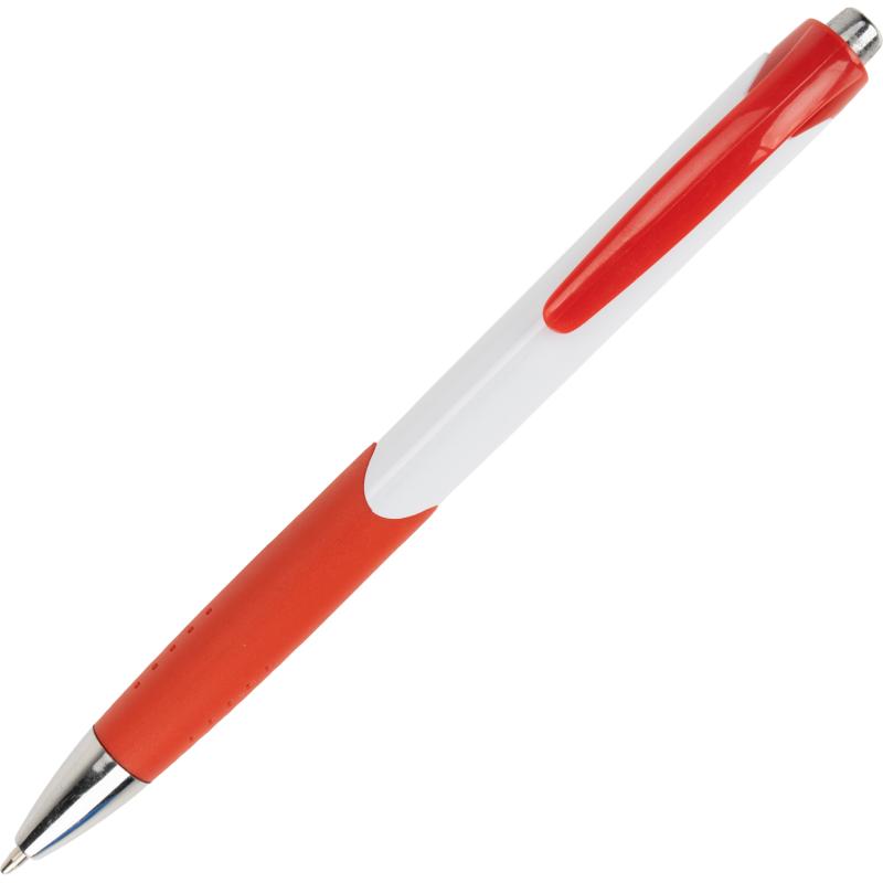 Długopis plastikowy, wyposażony w klips i gumową strefę chwytu oraz niebieski wkład.