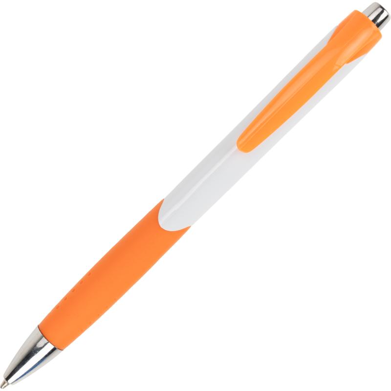 Długopis plastikowy, wyposażony w klips i gumową strefę chwytu oraz niebieski wkład.