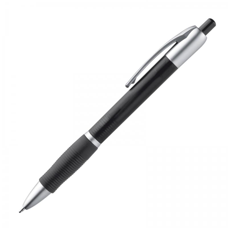 Plastikowy, transparentny długopis z niebieskim wkładem i gumową strefą chwytu. Kolorowy korpus ozdobiono srebrnymi elementami.