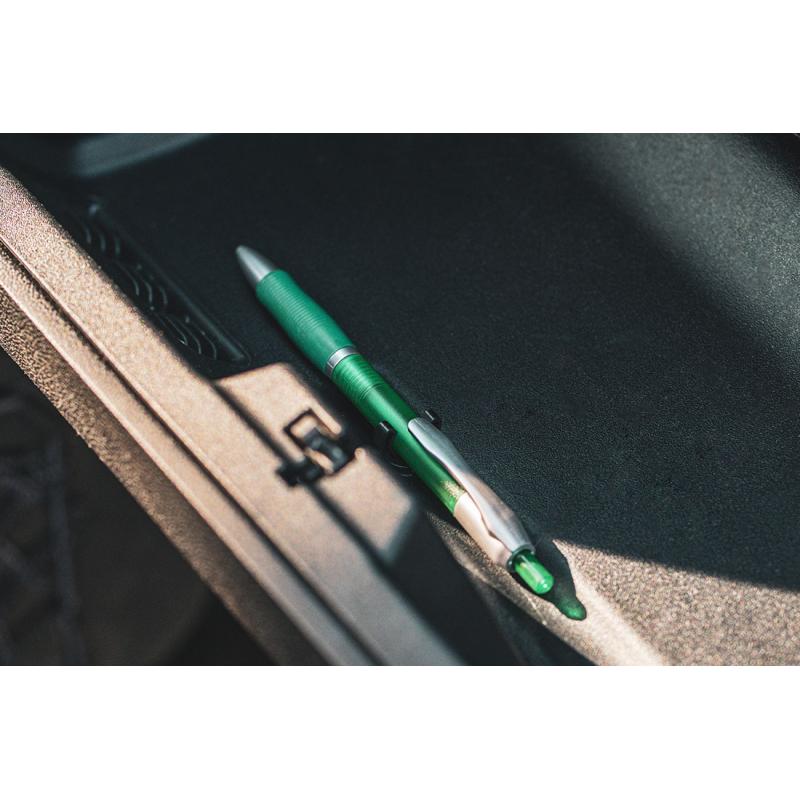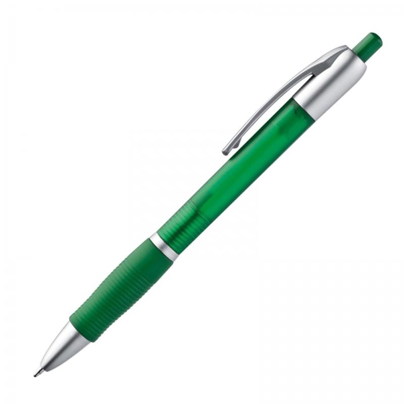 Plastikowy, transparentny długopis z niebieskim wkładem i gumową strefą chwytu. Kolorowy korpus ozdobiono srebrnymi elementami.