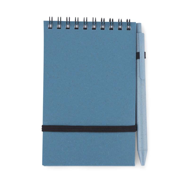 Notes TRESA z długopisem, kolorystyką dopasowanym do okładki. Długopis oraz okładka notesu wykonane są ze słomy pszenicznej. Notes na spirali, posiada 70 kartek w kratkę wykonanych z recyklingowanego papieru. Zamykany za pomocą gumki. Format A6. Wkład w długopisie w kolorze niebieskim.