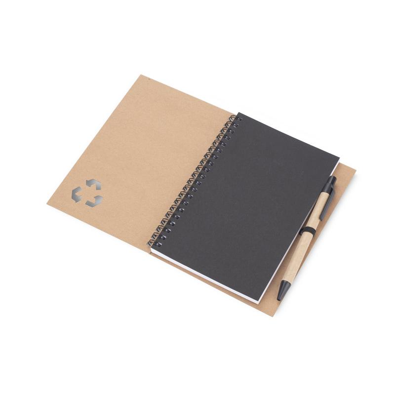 Notes SERENO na spirali w klasycznej, papierowej okładce. Posiada 70 kartek w linie. Do notesu dołączony jest w wyprofilowanym miejscu długopis, którego korpus wykonany jest z papieru. Wykończenia długopisu pasują kolorystycznie z przekładką notesu. Wkład w długopisie w kolorze niebieskim.
