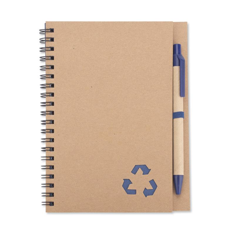 Notes SERENO na spirali w klasycznej, papierowej okładce. Posiada 70 kartek w linie. Do notesu dołączony jest w wyprofilowanym miejscu długopis, którego korpus wykonany jest z papieru. Wykończenia długopisu pasują kolorystycznie z przekładką notesu. Wkład w długopisie w kolorze niebieskim.