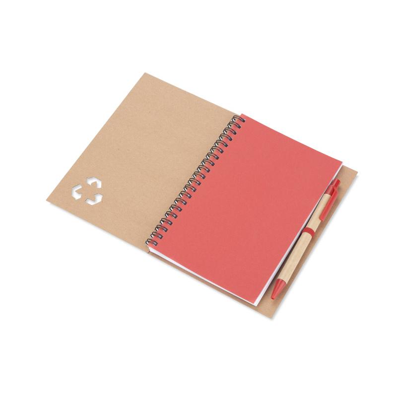 Notes SERENO na spirali w klasycznej, papierowej okładce. Posiada 70 kartek w linie. Do notesu dołączony jest w wyprofilowanym miejscu długopis, którego korpus wykonany jest z papieru. Wykończenia długopisu pasują kolorystycznie z przekładką notesu. Wkład w długopisie w kolorze niebieskim.