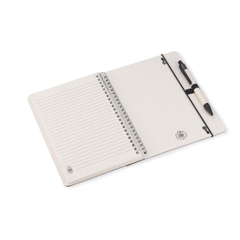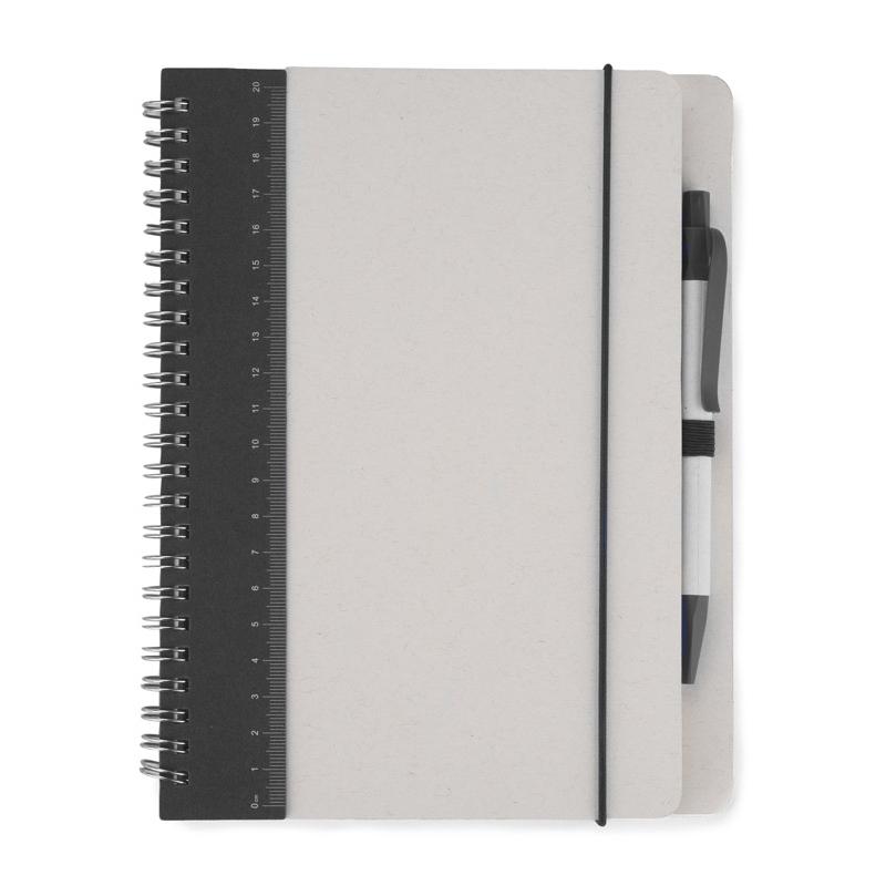 Notes REGALI wraz z długopisem wykonane są z kartonów po mleku. Długopis posiada wkład w kolorze niebieskim. Do notesu dołączona jest linijka o długości 20 cm pasująca kolorem do wykończeń na długopisie. Gumka na długopis oraz ta zamykająca notes w kolorystyce wykończeń długopisu.