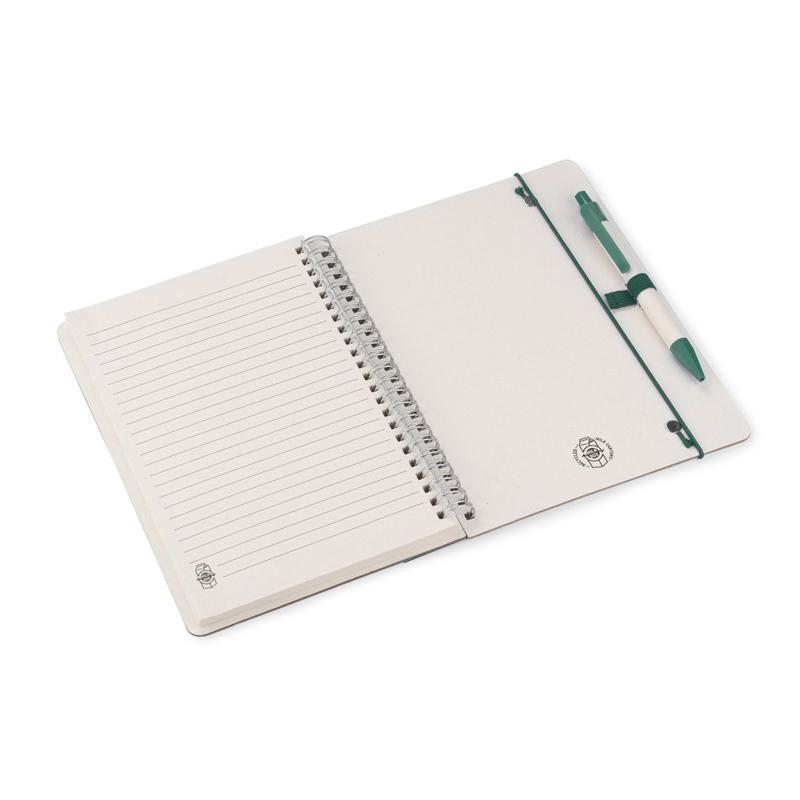Notes REGALI wraz z długopisem wykonane są z kartonów po mleku. Długopis posiada wkład w kolorze niebieskim. Do notesu dołączona jest linijka o długości 20 cm pasująca kolorem do wykończeń na długopisie. Gumka na długopis oraz ta zamykająca notes w kolorystyce wykończeń długopisu.