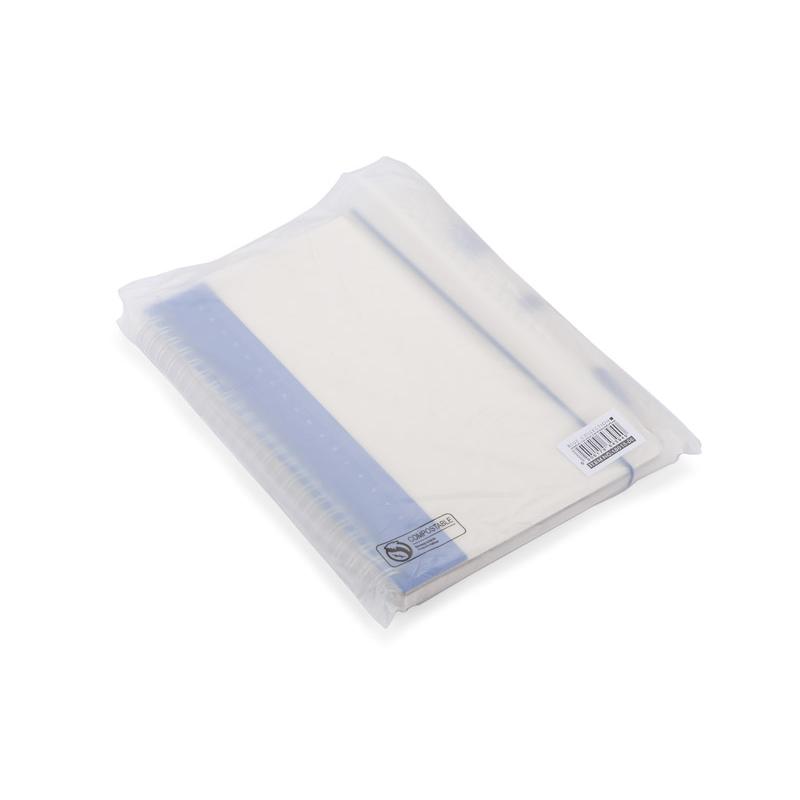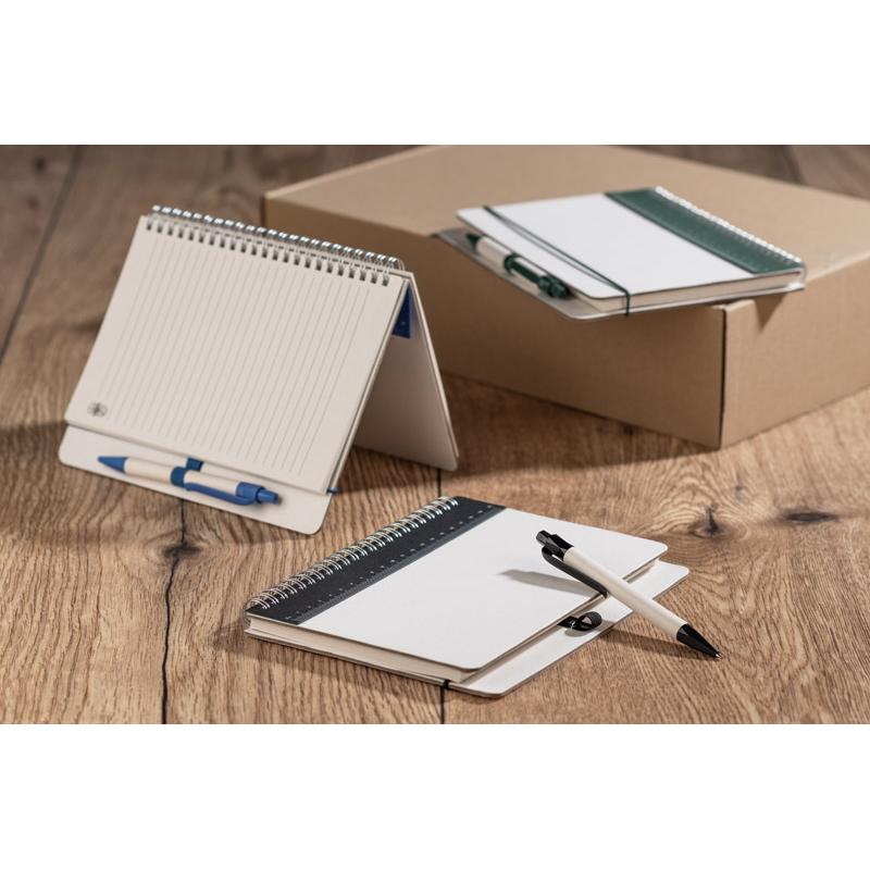 Notes REGALI wraz z długopisem wykonane są z kartonów po mleku. Długopis posiada wkład w kolorze niebieskim. Do notesu dołączona jest linijka o długości 20 cm pasująca kolorem do wykończeń na długopisie. Gumka na długopis oraz ta zamykająca notes w kolorystyce wykończeń długopisu.
