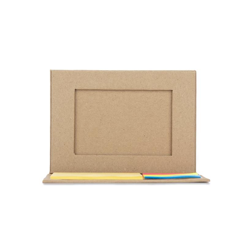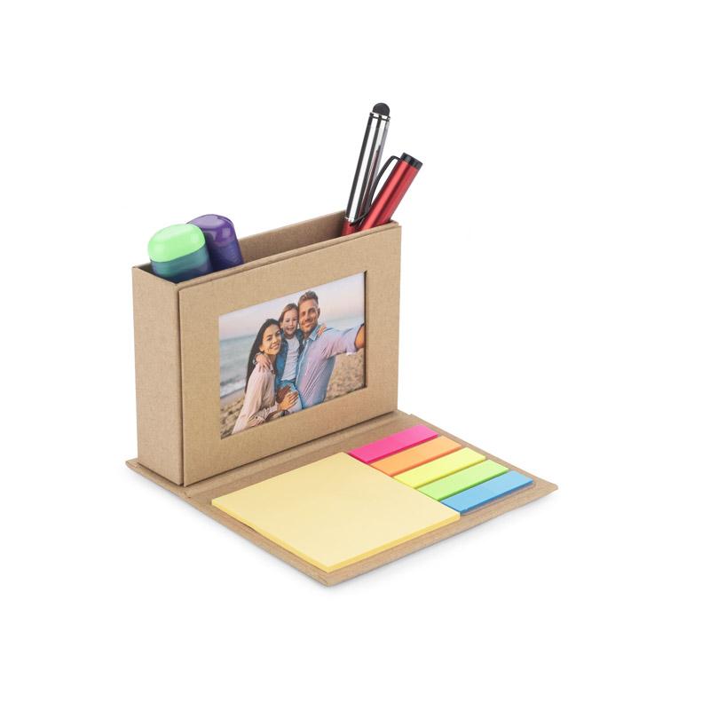 Pojemnik MEFO wykonany został z papieru w kolorze brązowym. Pełni on funkcję przybornika na biurko. Posiada miejsce na długopisy lub inne wybrane przybory, karteczki samoprzylepne do zapisywania notatek, a także miejsce na wizytówkę.