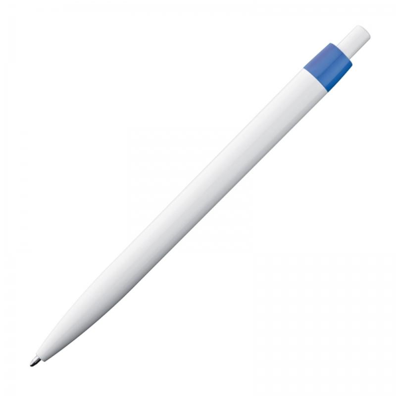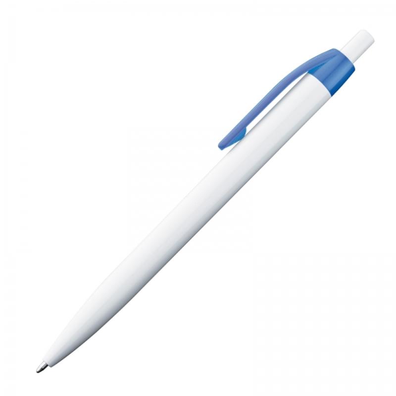 Plastikowy długopis z białym korpusem o klasycznym kształcie, wyposażony we wkład piszący na niebiesko.