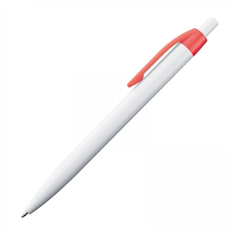 Plastikowy długopis z białym korpusem o klasycznym kształcie, wyposażony we wkład piszący na niebiesko.