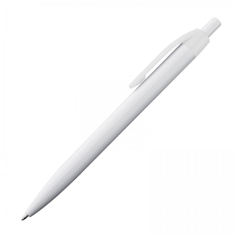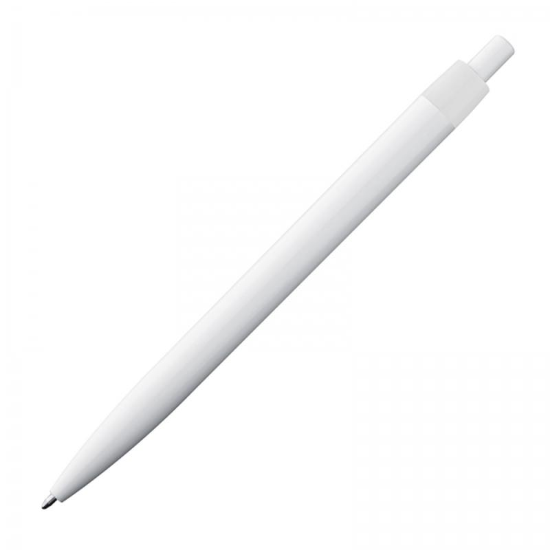 Plastikowy długopis z białym korpusem o klasycznym kształcie, wyposażony we wkład piszący na niebiesko.