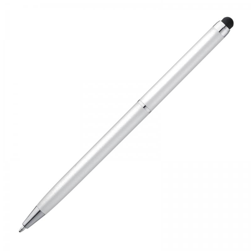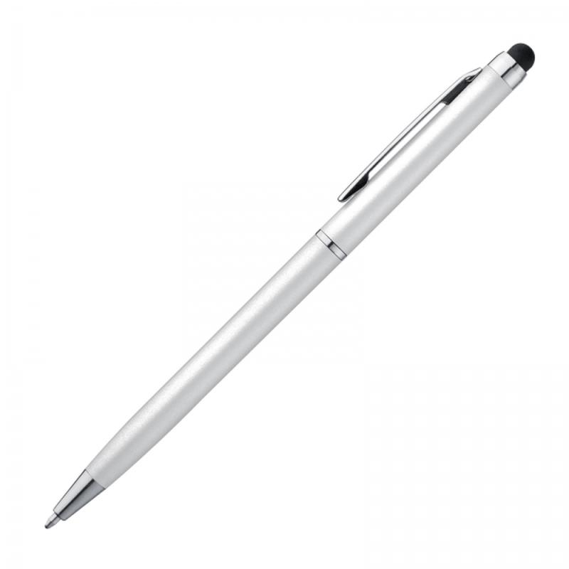 Smukły długopis plastikowy z mechanizmem obrotowym. Posiada wkład piszący na niebiesko i końcówkę do obsługi ekranów dotykowych.