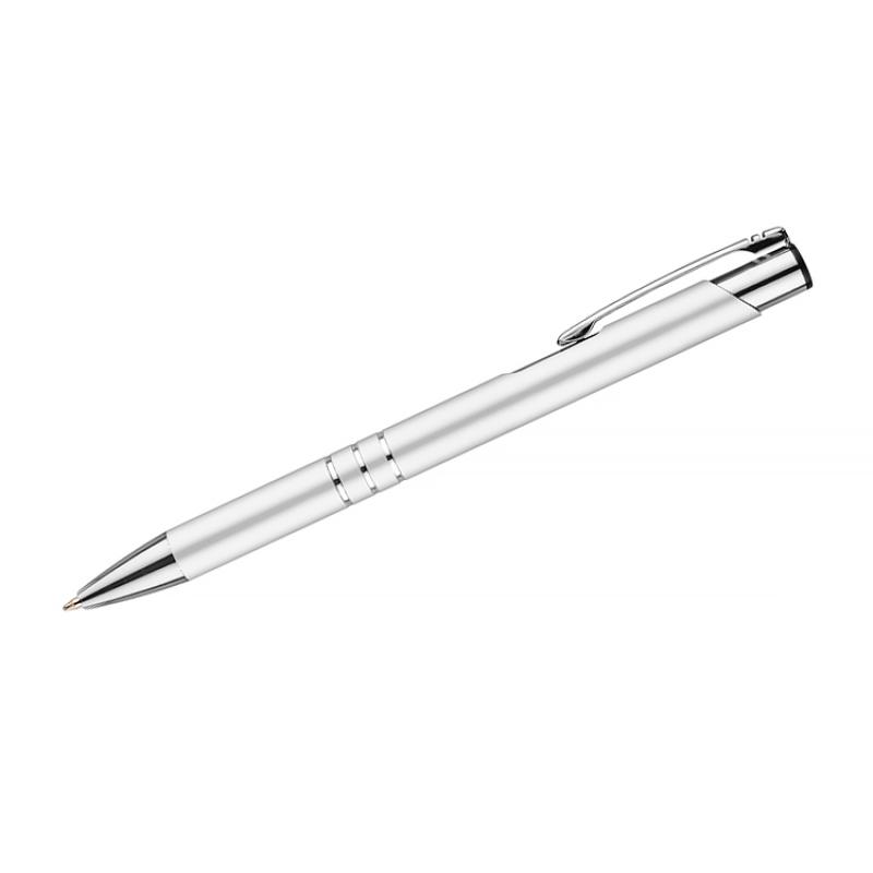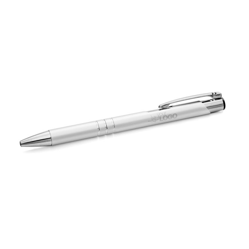 Metalowy długopis o metalizowanej chromowanej powierzchni. Długopis automatyczny z 3 ringami i niebieskim wkładem. Logo grawerujemy na powierzchni długopisu.