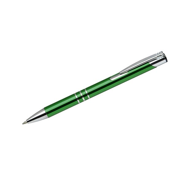Metalowy długopis o metalizowanej chromowanej powierzchni. Długopis automatyczny z 3 ringami i niebieskim wkładem. Logo grawerujemy na powierzchni długopisu.